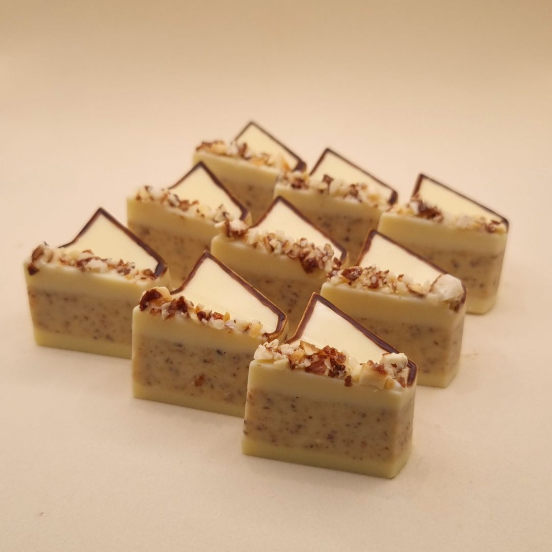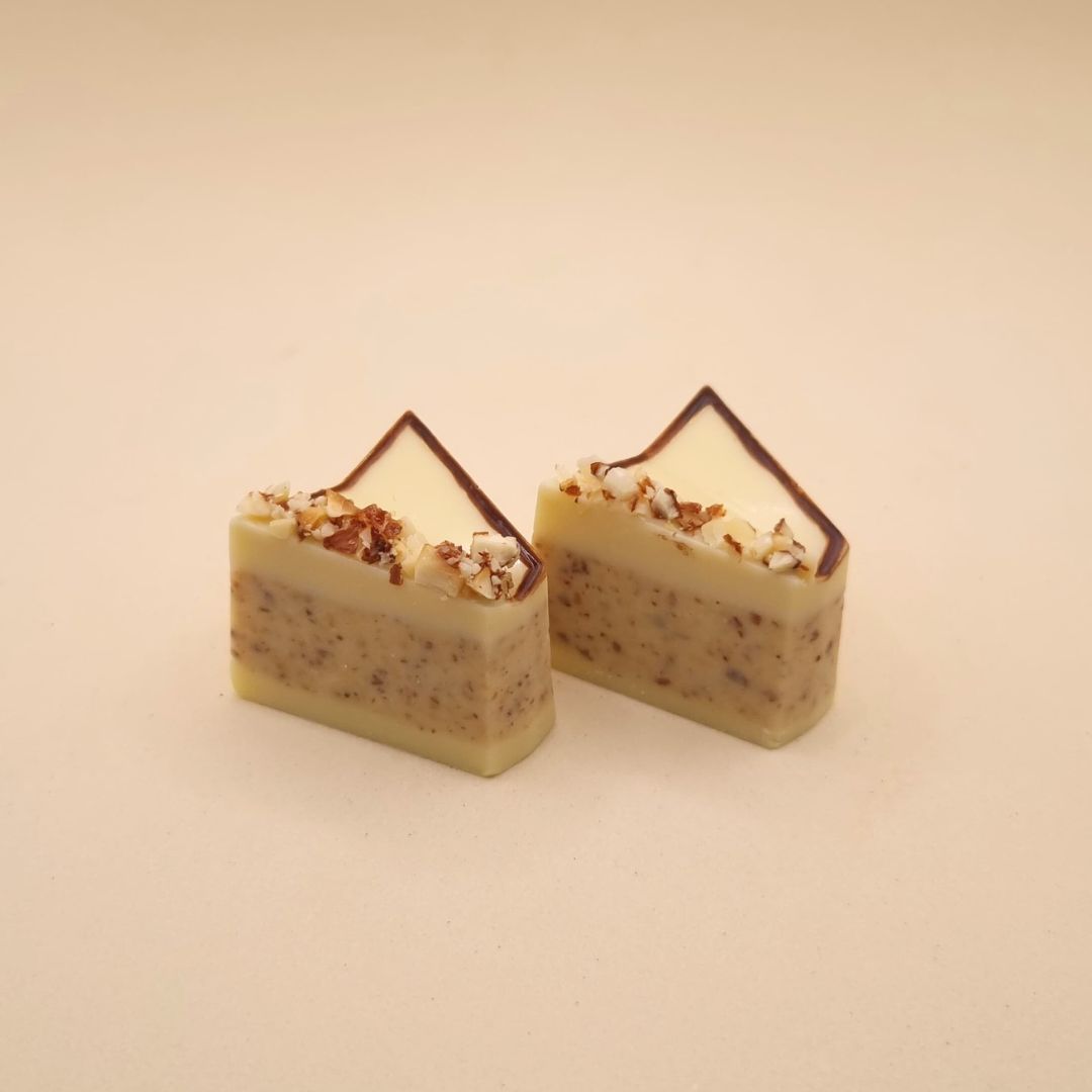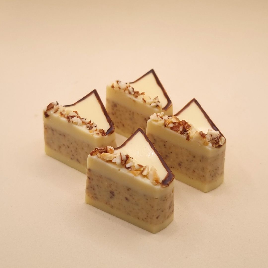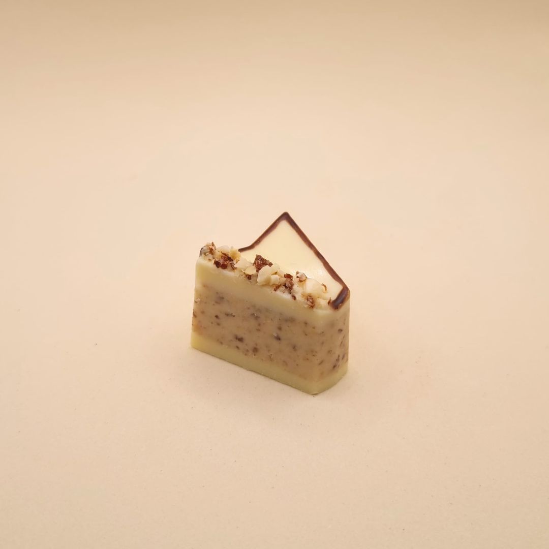 - Bombom maciço de chocolate branco nobre com uma camada de chocolate com amêndoas.